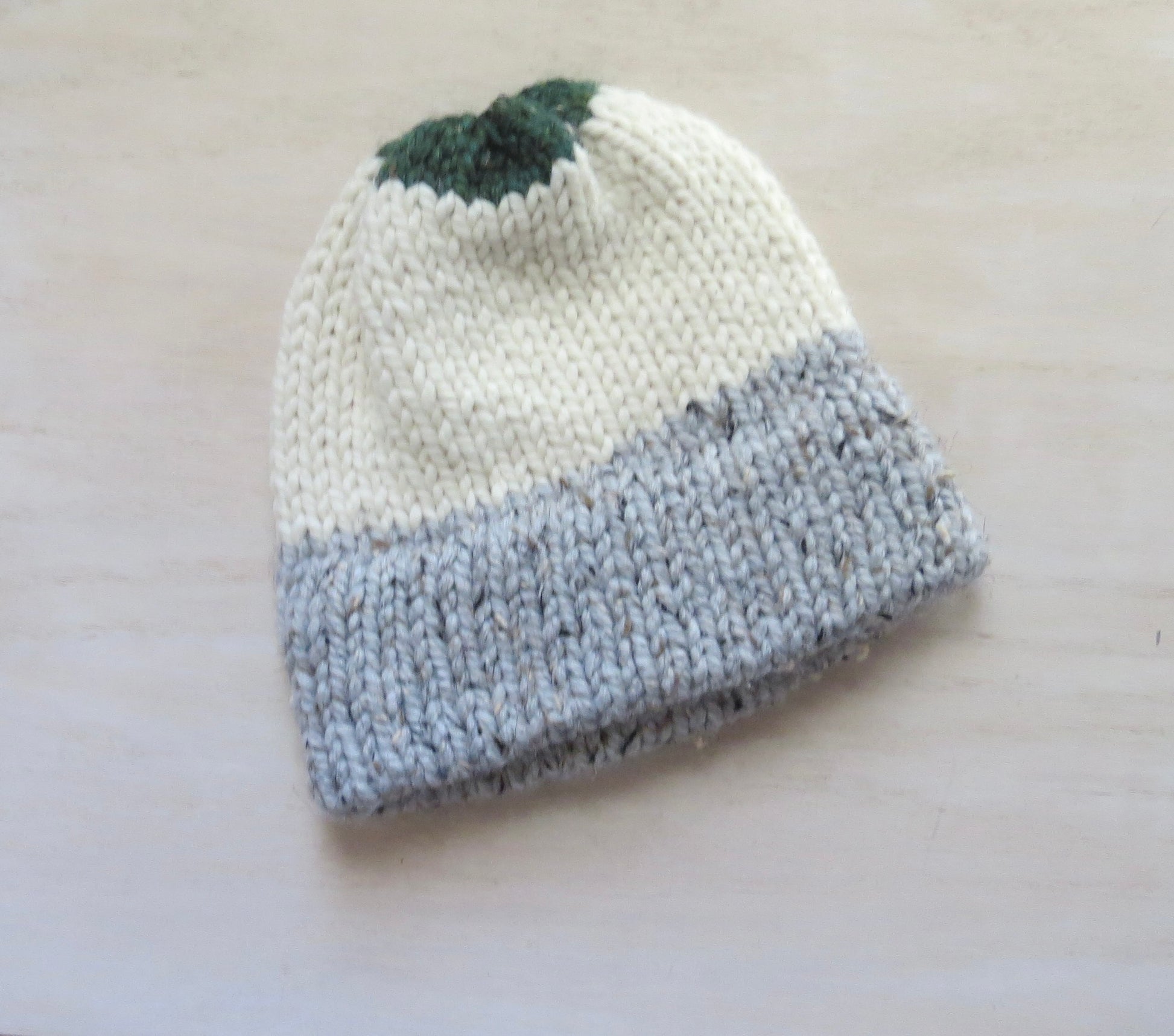 This hat is featured with gray, cream and dark green colored yarns to create a unique color block effect. This hat is ready to ship so it is currently the only one of it's kind! I